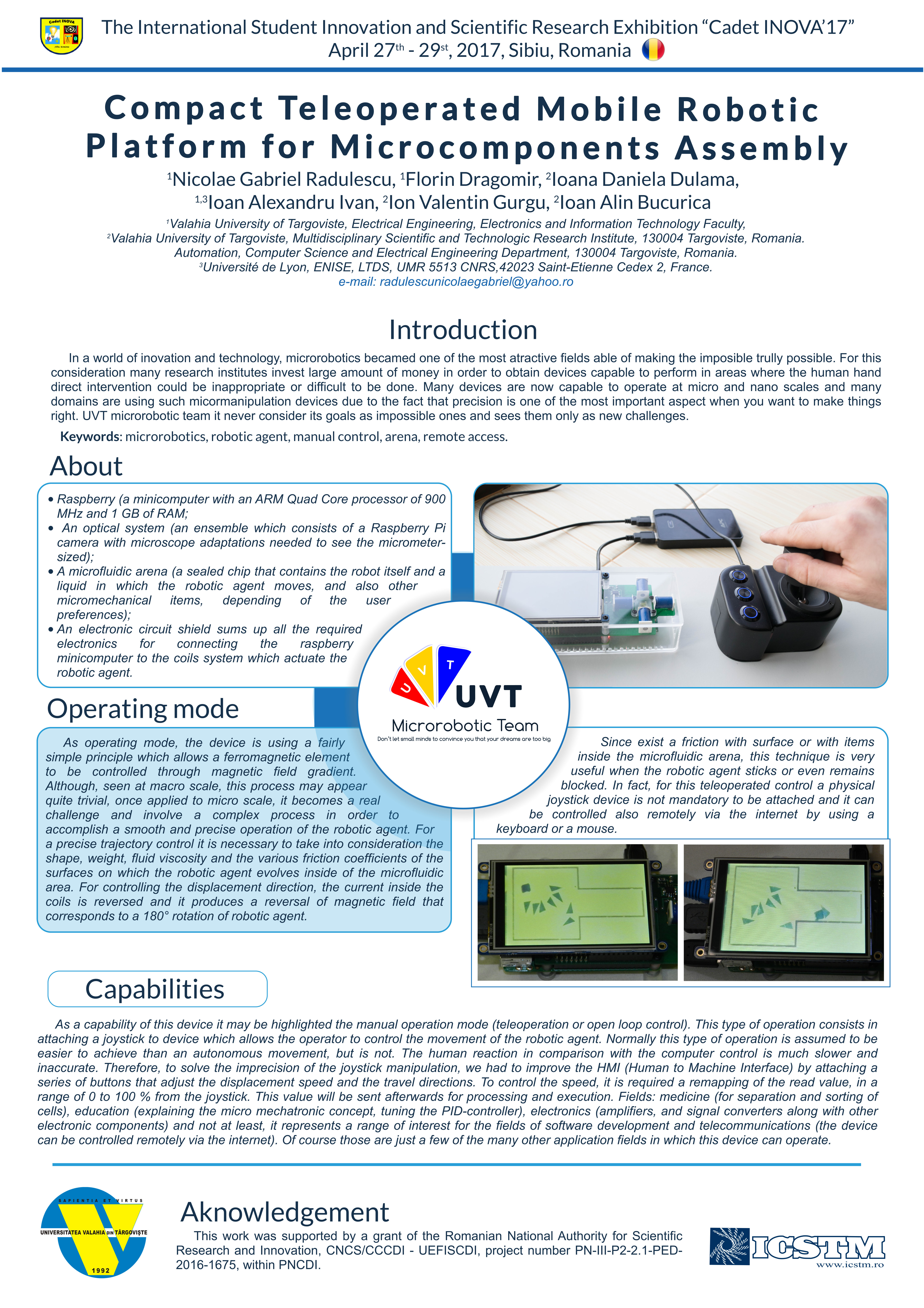 The UVT Team took part in the Microassembly Challenge, where microrobots must assemble multiple microscale components inside a narrow channel in a fixed amount of time. This task simulates anticipated applications of microassembly, including manipulation within a human blood vessel and the assembly of components in nanomanufacturing. The team competed in the even at the ”The International Conference on Robotics and Automation (ICRA)”, in Seattle, WA, USA, in period May 26-30, 2015
