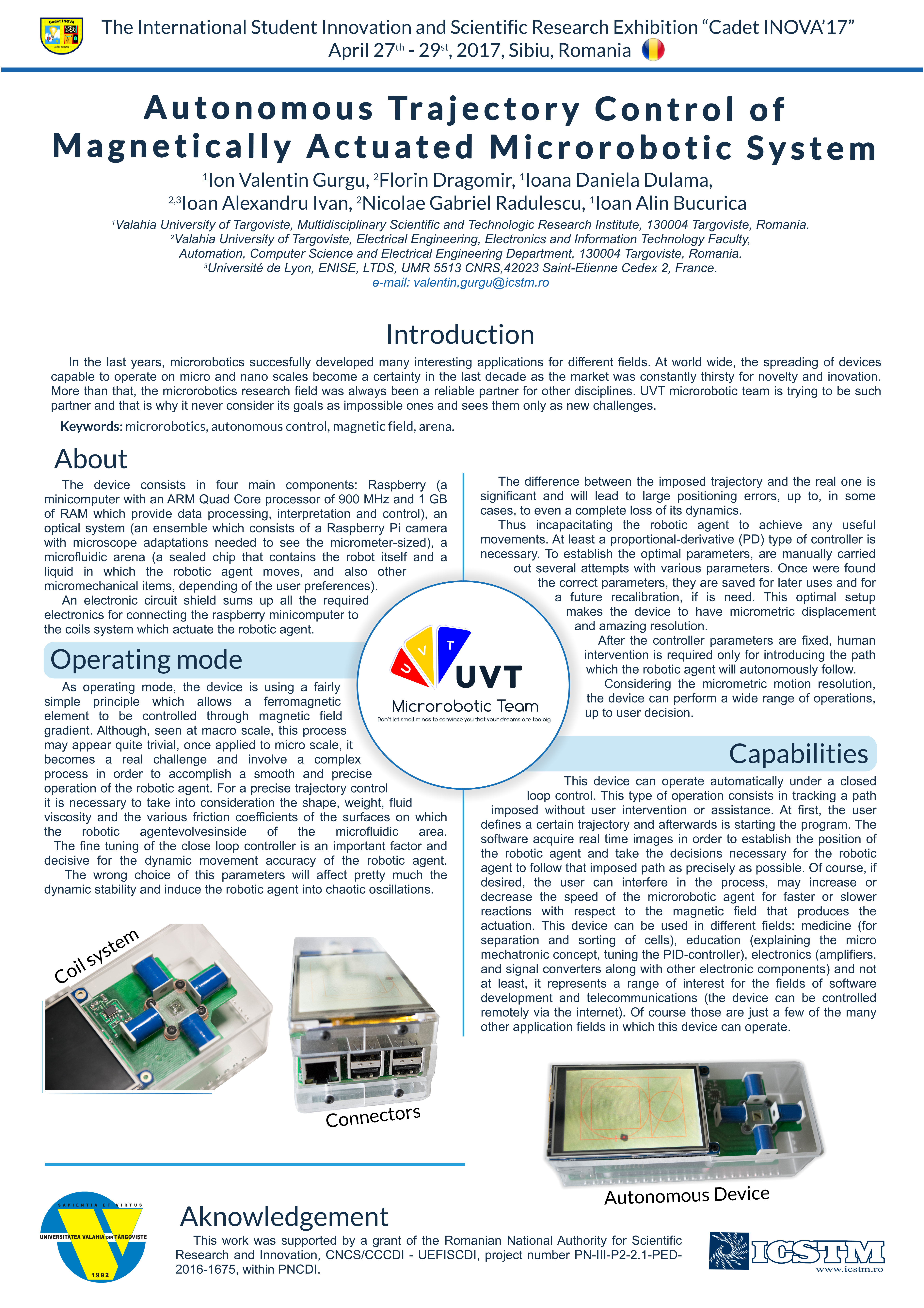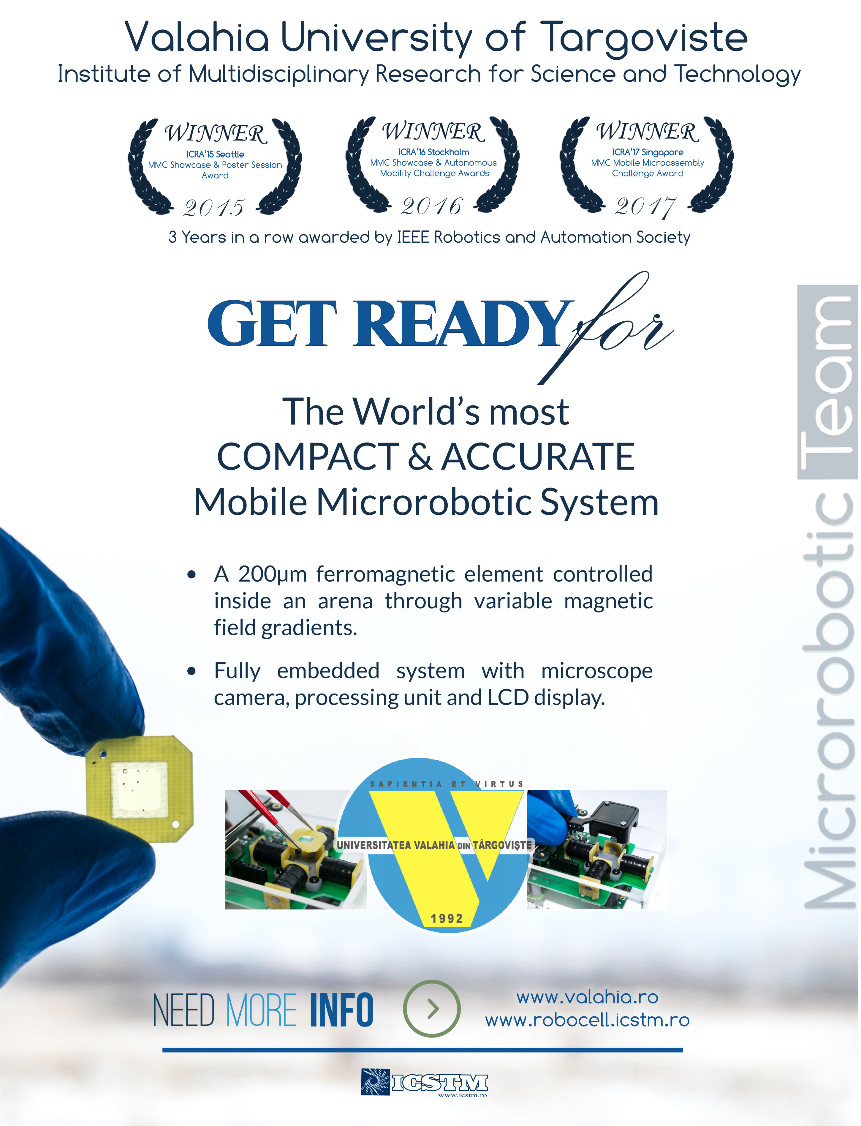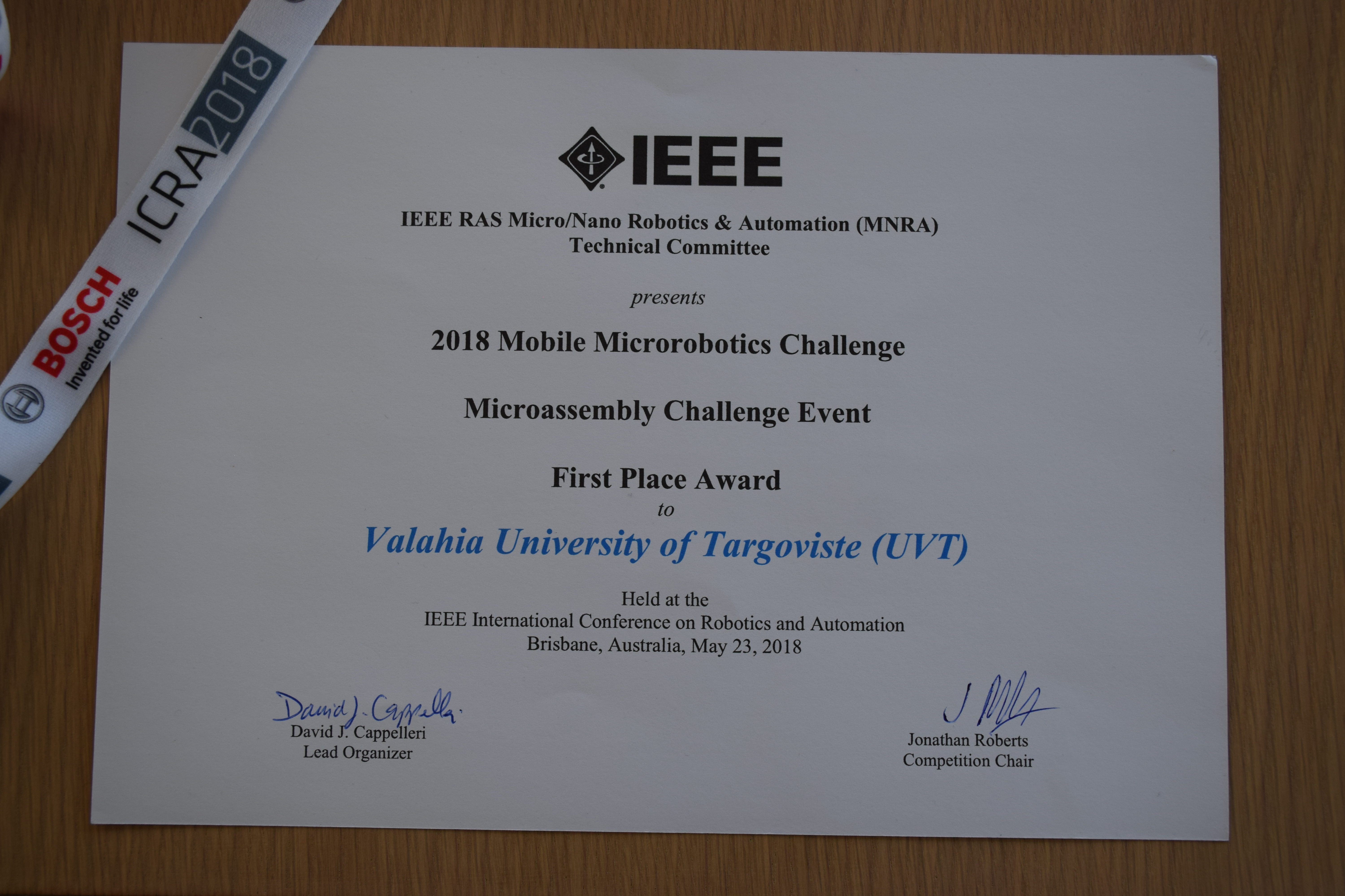 Working with a microrobot only 0.3x0.3x0.3 mm in diameter, the challenge was to assemble triangles with similar dimensions into a 0.6 mm - wide opening. Surpassing the competition, UVT team members assembled four triangles using magnetic actuators to move the robot across the tiny stage with millemetre dimensions. The team competed in the even at the ”The International Conference on Robotics and Automation (ICRA)”, in Brisbane, Australia, in period 21-25 May, 2018