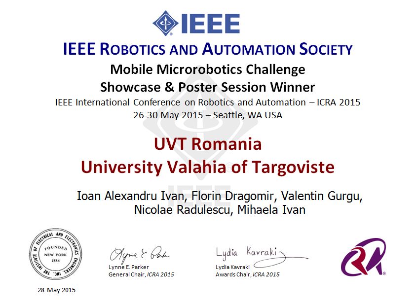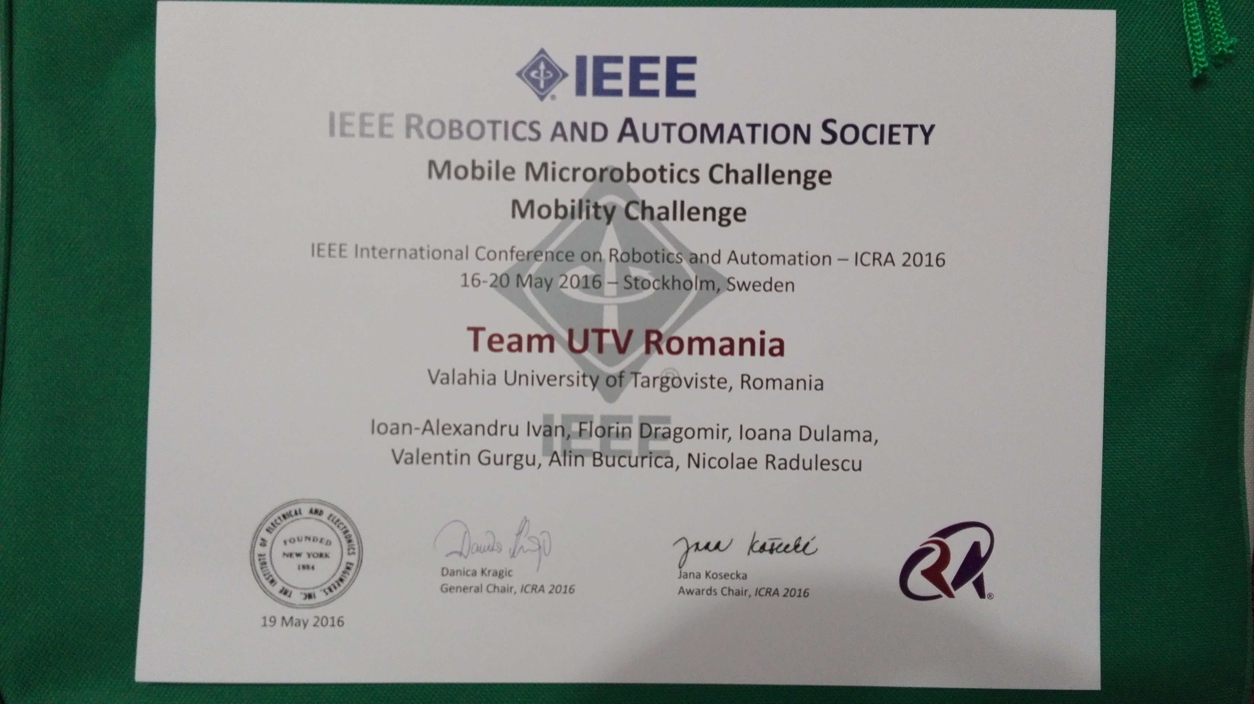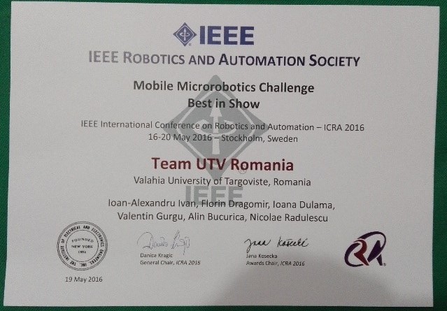 Premiul I in cadrul concursului 2016 Mobile Microrobotics Challenge secțiunea ”Autonomous Mobility & Accuracy Challenge”