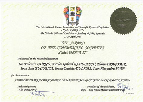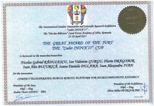 The “Cadet INOVA” event has been conceived as an opportunity for the young researchers to present the results of their innovations and research as prototypes, maquettes, computerized presentation of techniques and procedures accompanied by posters and to achieve scientific partnerships in order to identify technological, industrial and research niches. The team competed in the even at the International Student Innovation and Scientific Research Exhibition - ”Cadet INOVA’17”, organized by “Nicolae Bălcescu” Land Forces Academy from Sibiu in period 27-29 April 2017