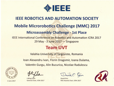 Premiul I in cadrul concursului 2017 Mobile Microrobotics Challenge secțiunea ”Microassembly Challenge”