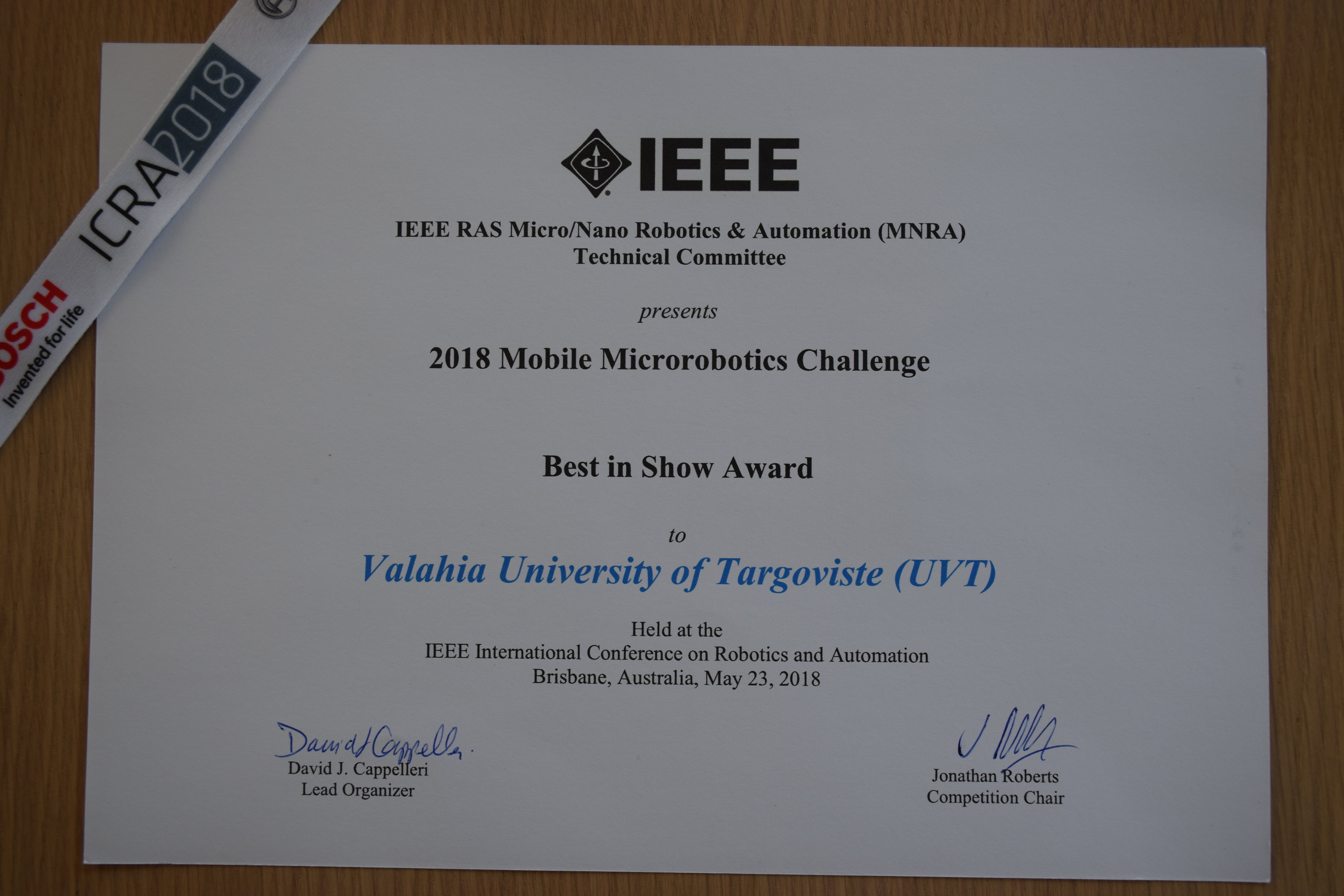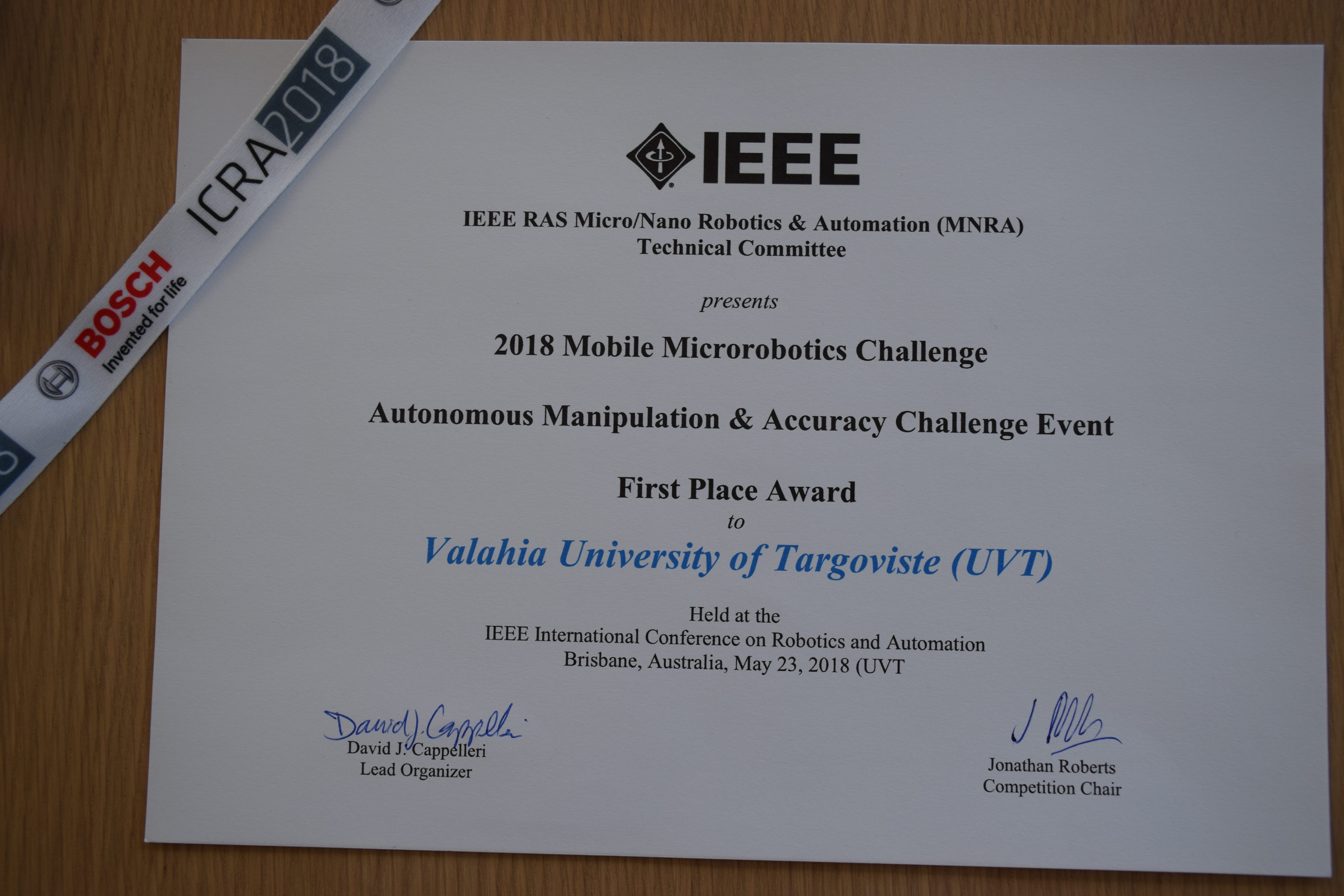 Premiul I in cadrul concursului 2018 Mobile Microrobotics Challenge secțiunea ”Autonomous Mobility & Accuracy Challenge”