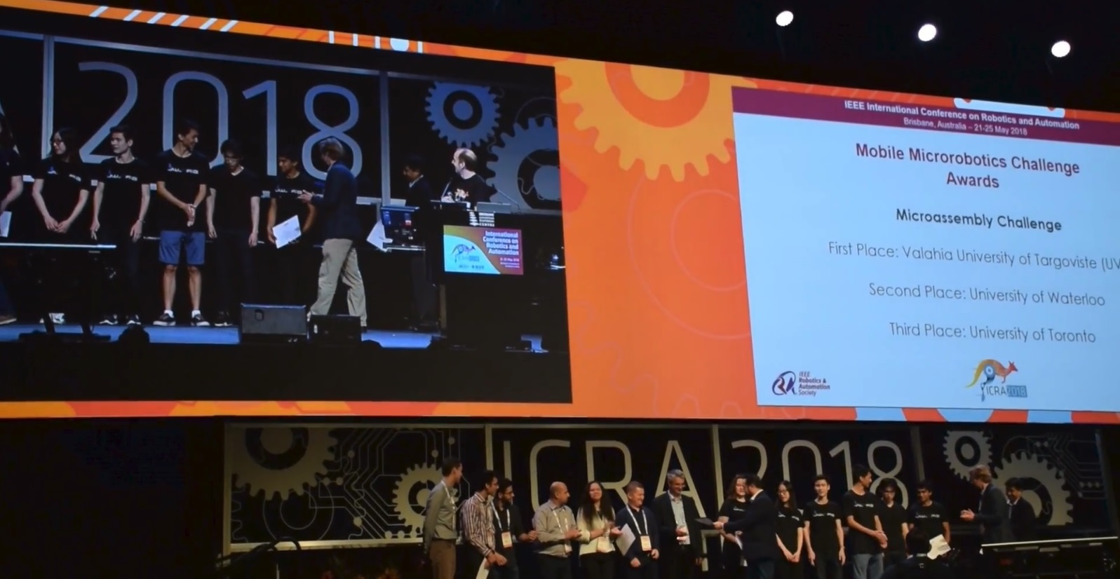 Placing first in the Microassembly Challenge, teams pushed their microrobots to assemble multiple microscale components inside a narrow channel in a fixed amount of time. The task is intended to simulate anticipated applications of microassembly, including manipulation within a human blood vessel and the assembly of components in nanomanufacturing. The team competed in the even at the ”The International Conference on Robotics and Automation (ICRA)”, in Singapore, in period 29 May – 3 June, 2017