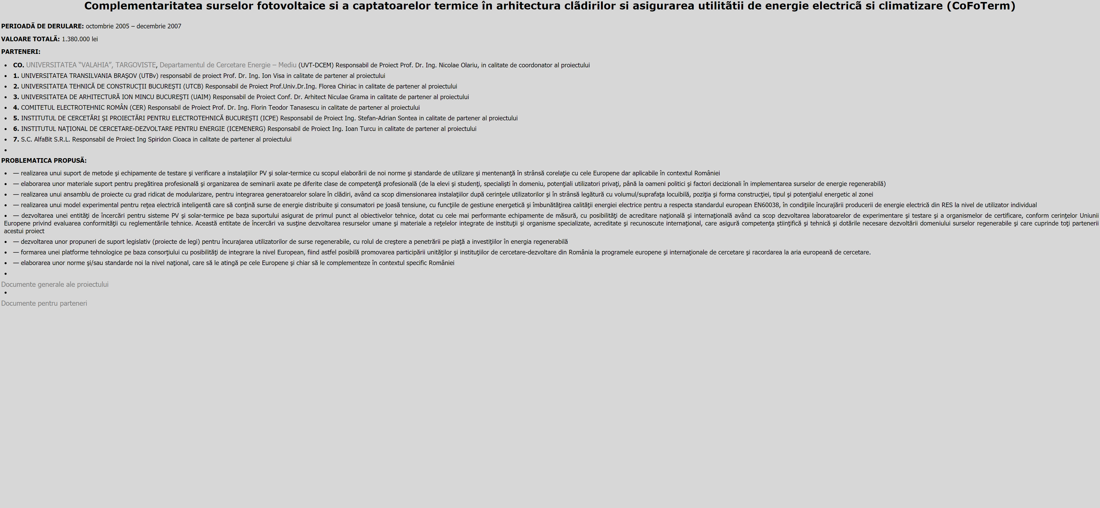 The photovoltaic modules and thermals collectors duality in building integration and for the assurance of electrical energy utility and air-conditioning / Complementaritatea surselor fotovoltaice şi a captatoarelor termice în arhitectura clădirilor şi asigurarea utilităţii de energie electrică şi climatizare (COFOTERM)