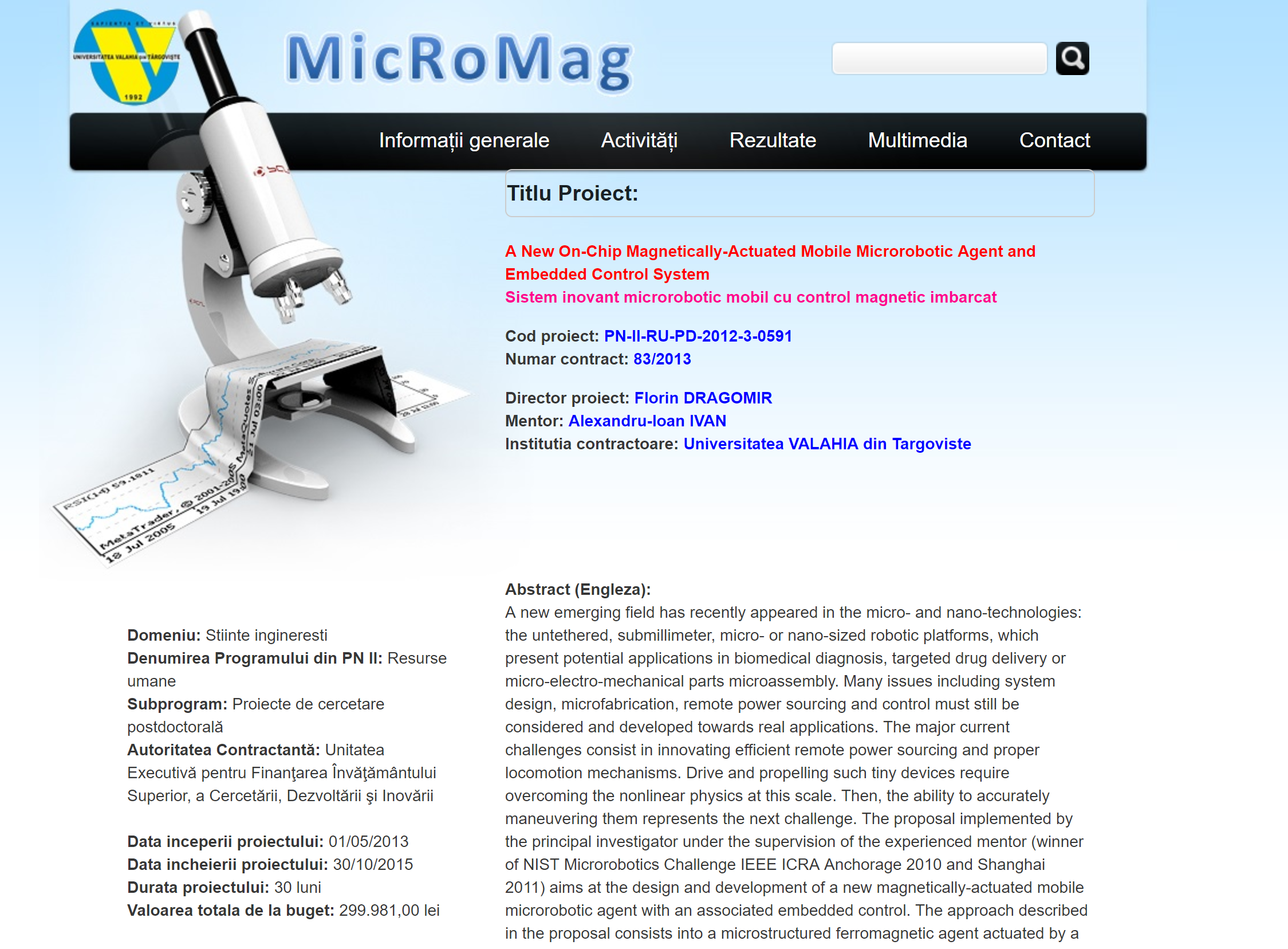 A New On-Chip Magnetically-Actuated Mobile Microrobotic Agent and Embedded Control System / Sistem inovant microrobotic mobil cu control magnetic îmbarcat (MicRoMag)