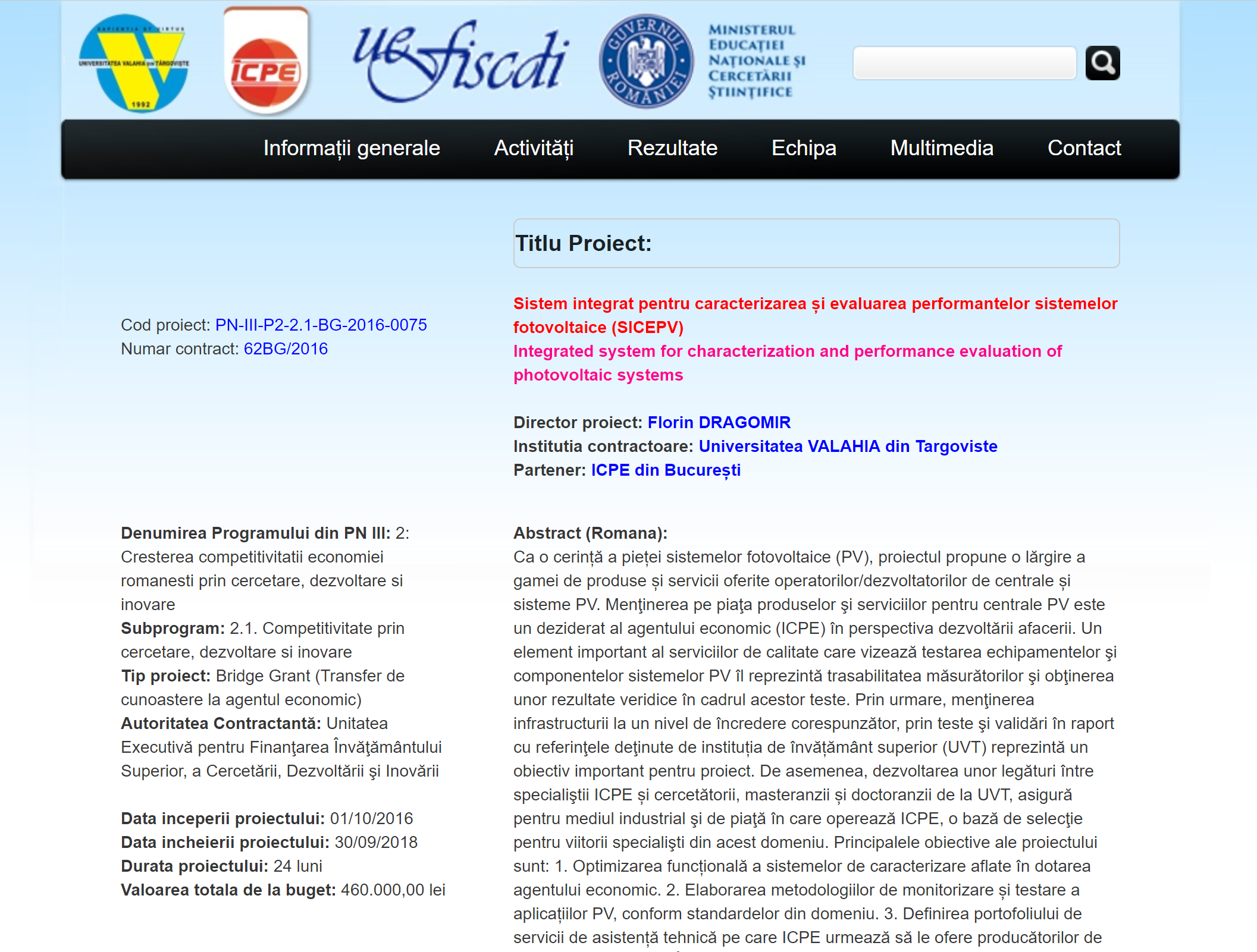 Integrated system for characterization and performance evaluation of photovoltaic systems / Sistem integrat pentru caracterizarea și evaluarea performantelor sistemelor fotovoltaice (SICEPV)